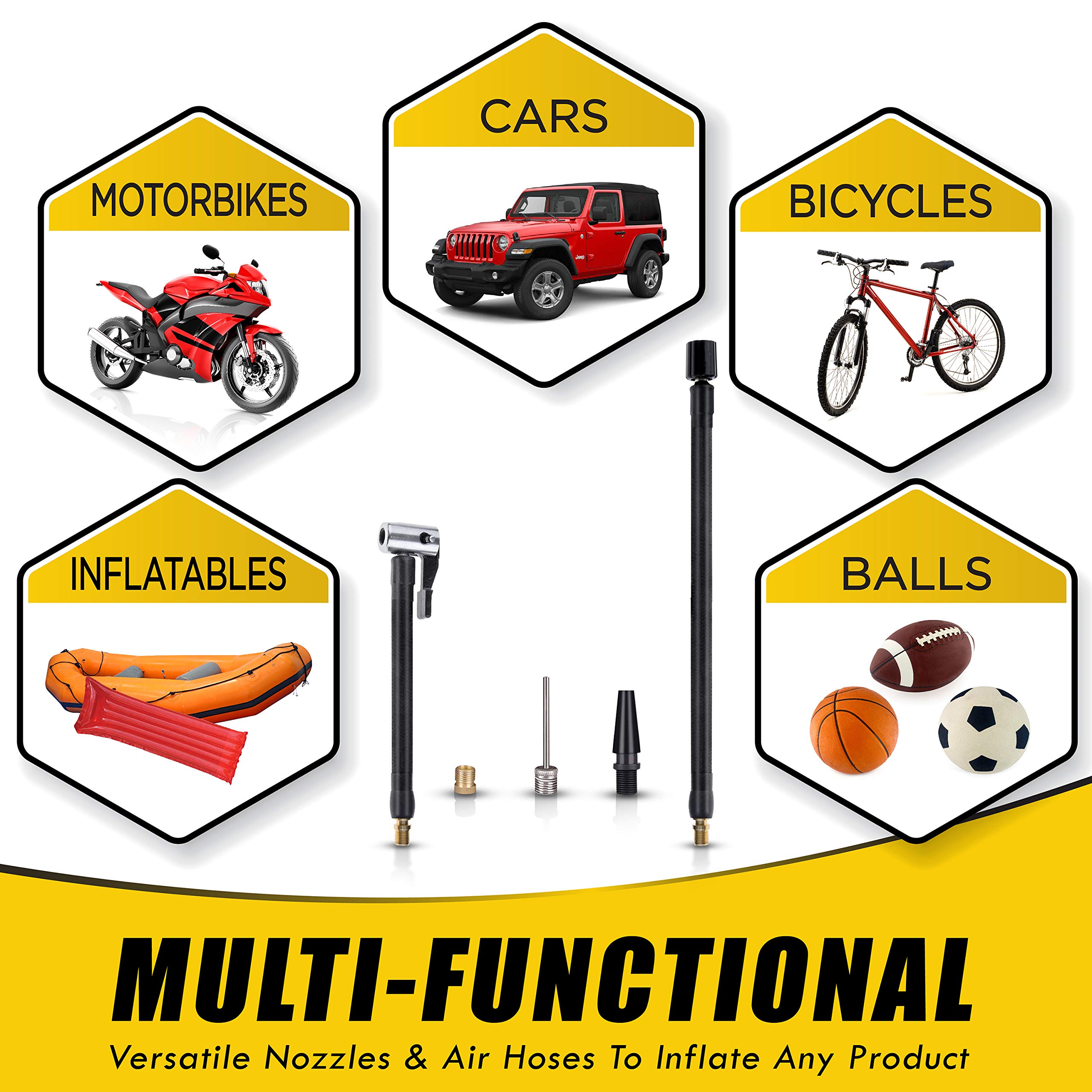 INNOVATIVE, INTELLIGENT, MULTI-FUNCTIONAL, EASY TO USE – Handheld with the ergonomic care for or use hands-free. For indoor and outdoor use: inflates car tires (small/medium-sized, SUV included), motorcycle, and bicycle tires (Not for tractors or trucks), airbeds, pools, and toys, and so forth. Connect the hose to the air nozzle, screw onto the valve and press the trigger. With our new Tire Pressure Monitor System (TPMS) the compressor will shut off automatically when it reaches the preset pressure!